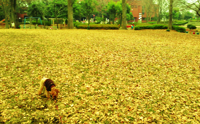 芝生の広場が落ち葉で埋め尽くされていました。